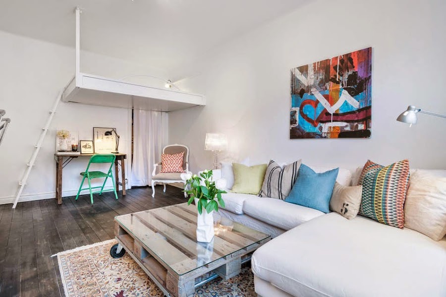 Donde se ubica la zona de estar con un gran sofá blanco es perfecto para un pequeño estudio y una mesa de centro realizada con palets, en este mismo espacio se accede a la cama situada en un pequeño altillo.