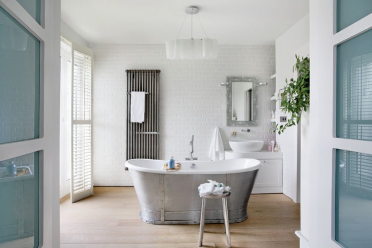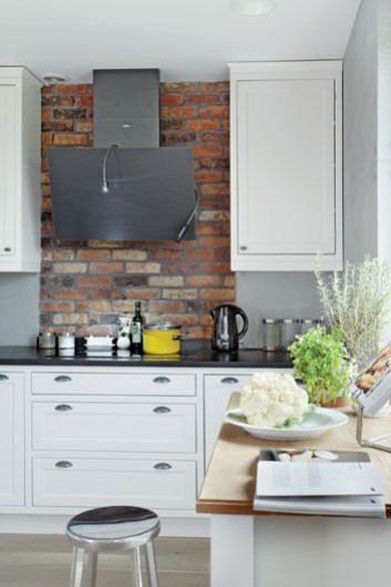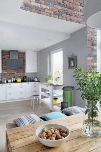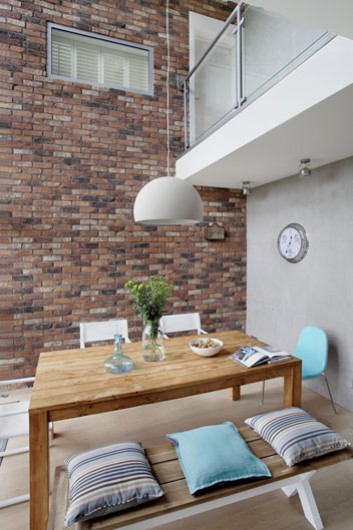 Me encanta la zona de comedor, con la pared de ladrillo como protagonista, la mezcla de sillas me parece todo un acierto, combinando diferentes estilos e incluyendo un banco, idea que me parece genial.