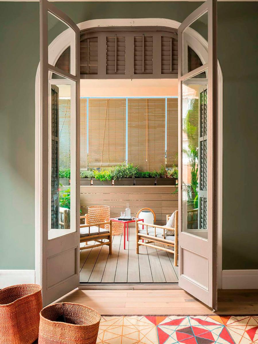 En la primera imagen ya encontramos una joya, la terraza, que aún no siendo muy grande deja el suficiente espacio para una zona de relax que invita a contemplar los edificios de una Barcelona modernista. Los muebles, que parecen de bambú pero son de madera, son de Tine K Home.