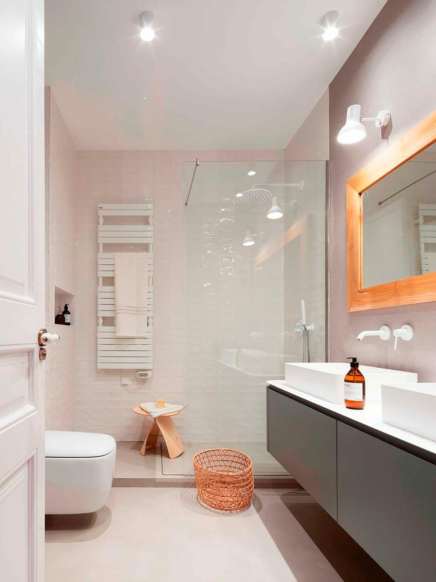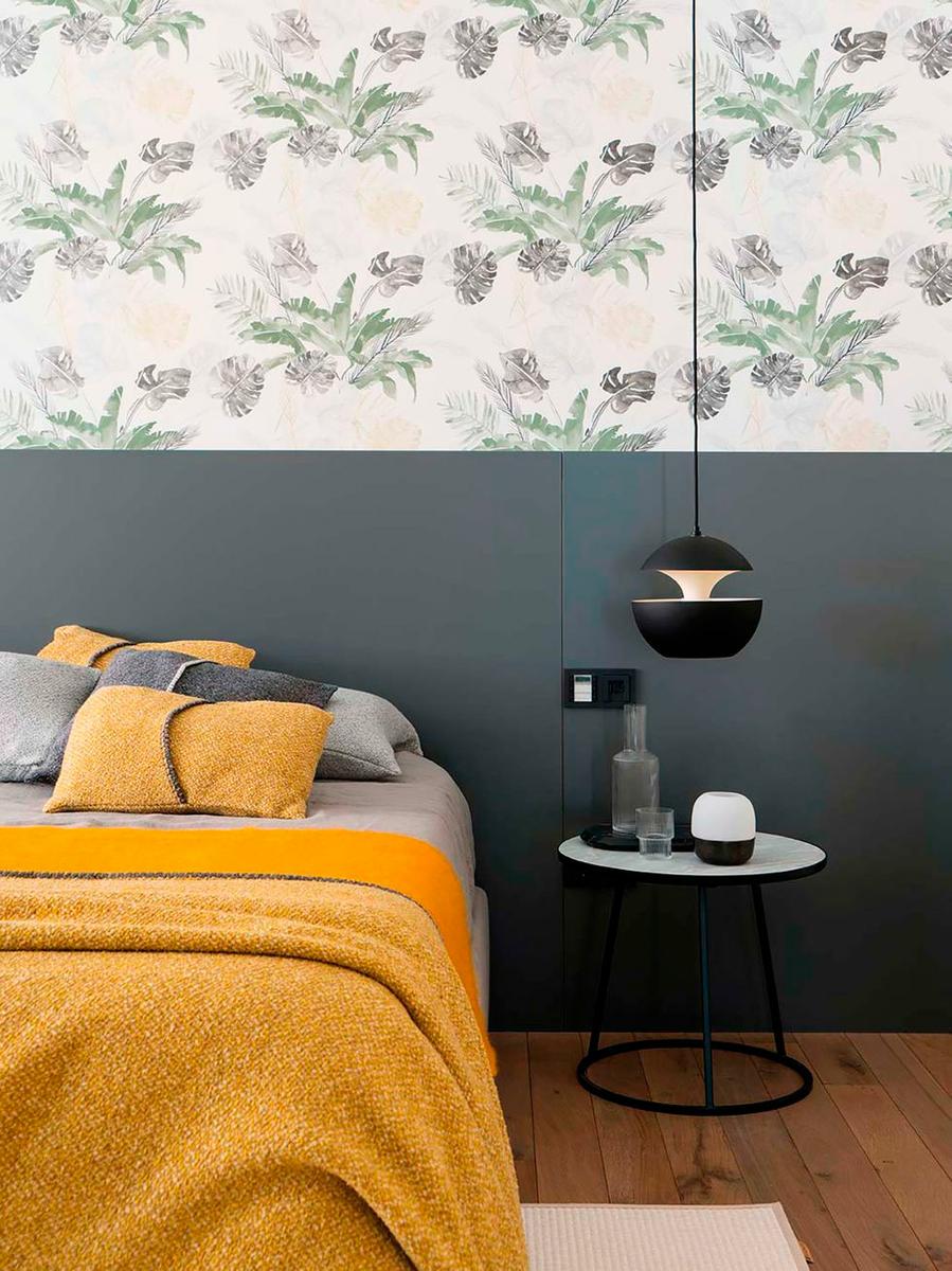 Por último el gran dormitorio está dividido visualmente en dos partes gracias al gran arco original de la casa, bajo él se ha creado una zona de relax donde ver la televisión y al otro lado, la zona de descanso. Una gran cama, vestida en grises y mostaza, contrasta a la perfección con el papel pintado y el panel gris que hace las veces de cabecero. Junto al dormitorio encontramos el baño principal, sobrio y sencillo. Mismo gris para los armarios suspendidos, griferías en blanco de la firma Tres y discretos azulejos también en blanco de Equipe. La nota cálida la aportan el espejo y el banco de madera y el cesto de fibras.