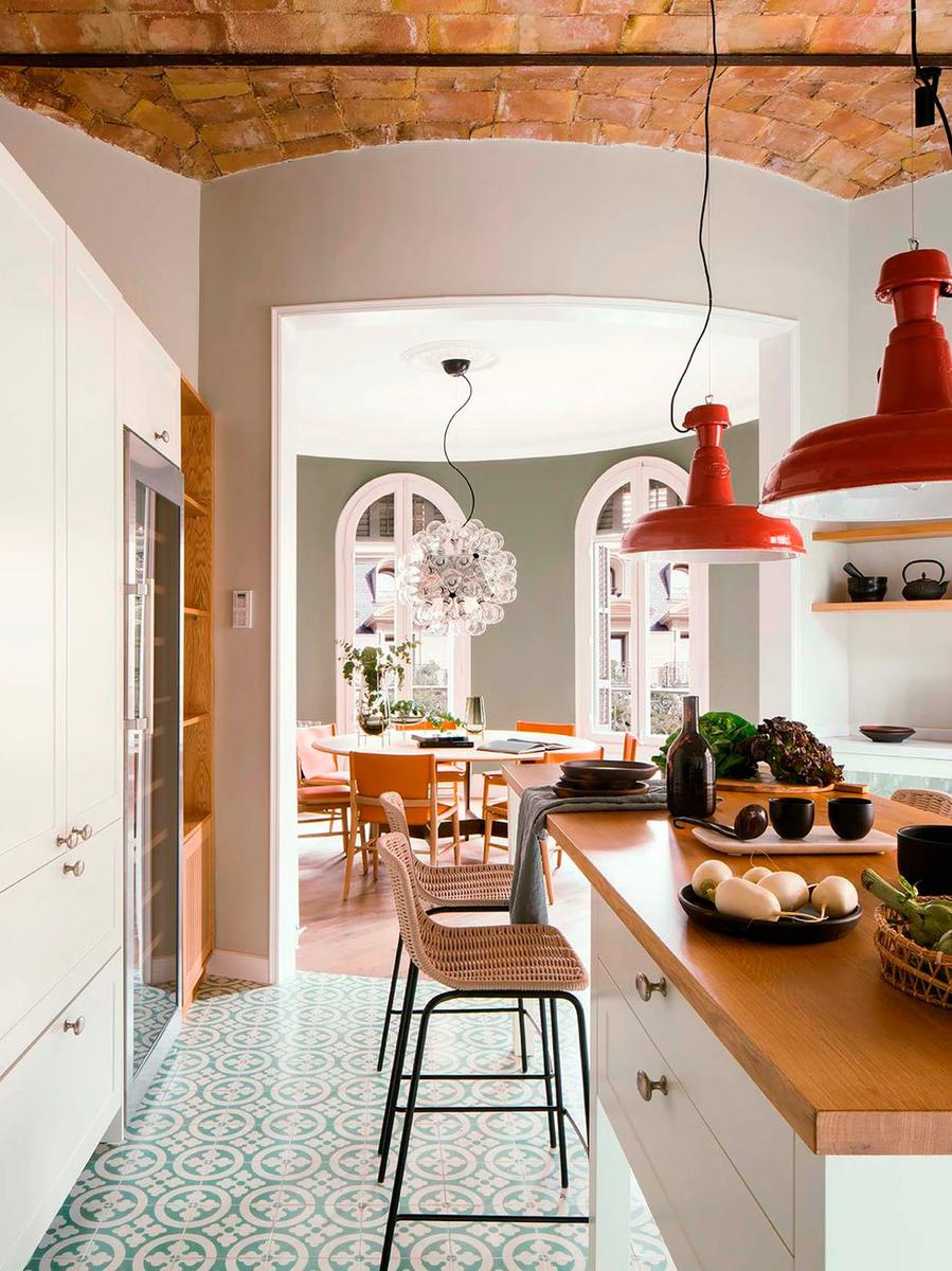 Otro espacio para tomar nota es la cocina, donde la familia hace mucha vida. La combinación de los techos originales de bovedillas con el hidráulico antiguo, hacen un tándem muy especial. El mobiliario de cocina es de Leicht y los taburetes de Expormin, todo muy sencillo. La nota de color la ponen las lámparas de corte industrial de Toscot.