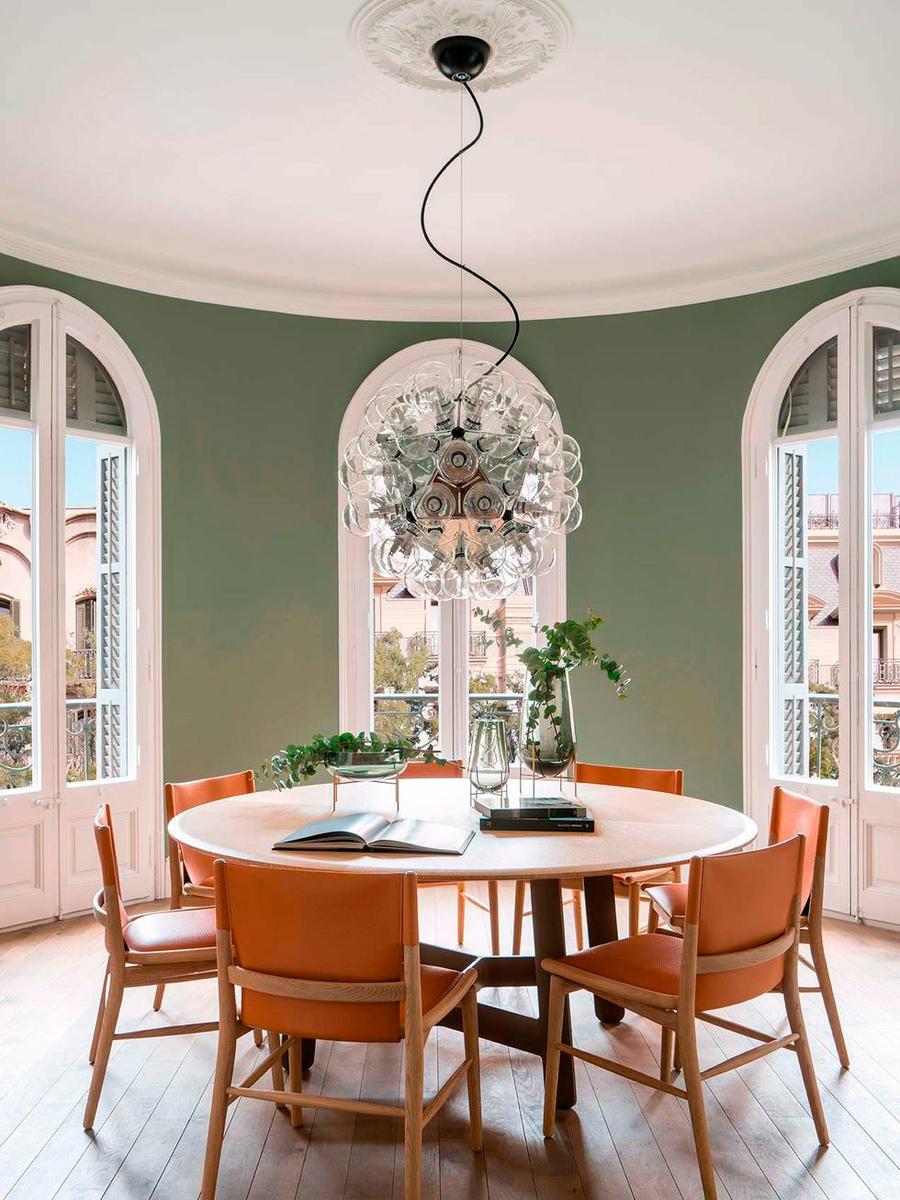 De la cocina pasamos al comedor, es ahí donde mejor se refleja la arquitectura circular. Para ir acorde a ella, se ha vestido con una mesa redonda y varias sillas, todo de B&B Italia, acompañada de la conocida lámpara Taraxacum de 120 focos circulares también, de Achille Castiglioni para Flos. Y contiguo al comedor, una sala polivalente que sirve tanto de despacho, como sala para el relax, y donde igualmente las curvas siguen estando reflejadas en las piezas escogidas, mi favorita es el sofá Face to Face, de Tacchini,