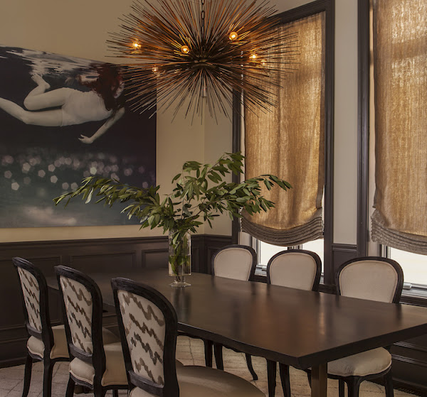 En el comedor una fabulosa lampara de techo en acabado dorado marca el centro de atención. En las paredes y textiles de la estancia tonos neutros que refuerzan a los muebles y complementos.
