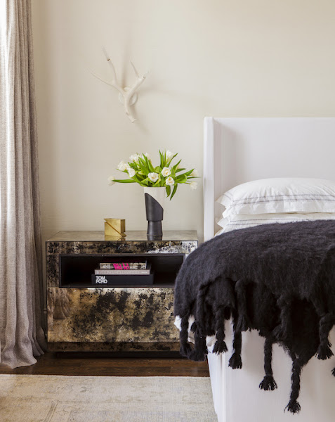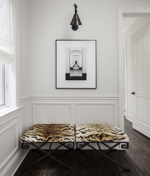 En el dormitorio la decoración se sofitica con detalles como el tapizado animal print de la pareja de banquetas o el acabado en cristal al ácido de las mesillas de noche.