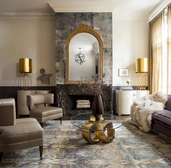El salón gira en torno a la mesa de centro de estructura dorada y sobre de cristal. Frente al sofá dos elegantes butacas vintage. Los detalles sofisticados en dorado dan luminosidad y suben el nivel decorativo.