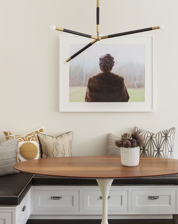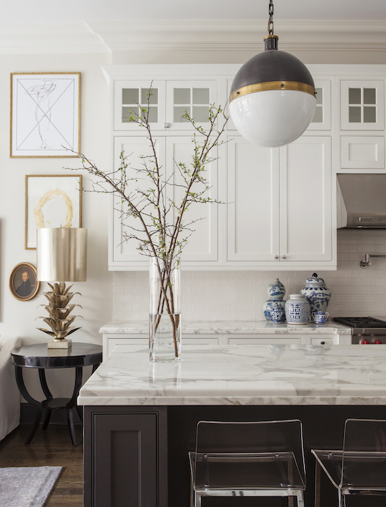 En la cocina se ha creado una zona de estar con un sofá en color blanco y uan mesa de centro con tapizado capitone. Fijaos en la combinación de cuadros de distintos tamaños encima del sofá y las mesas auxiliares de los laterales. Crean un elegante espacio digno de un salón principal.