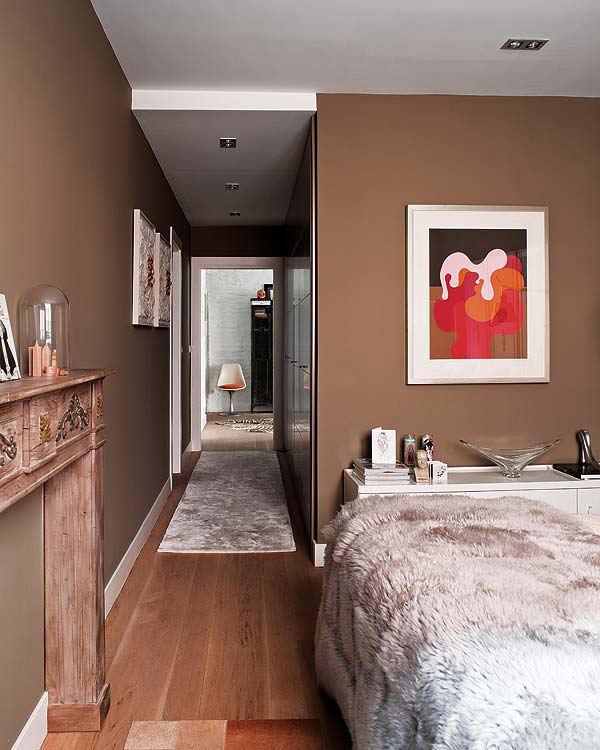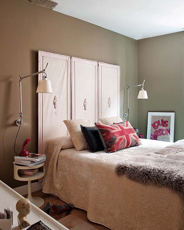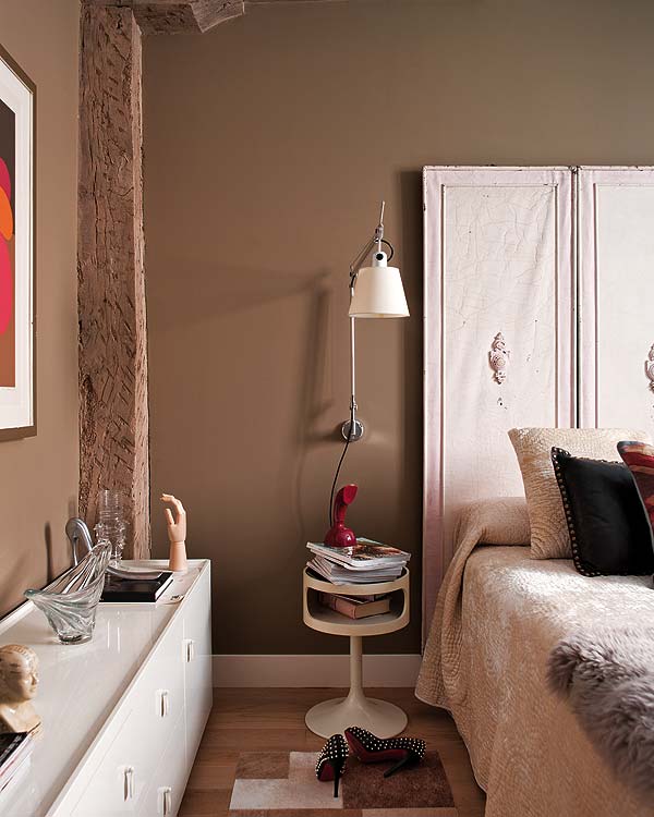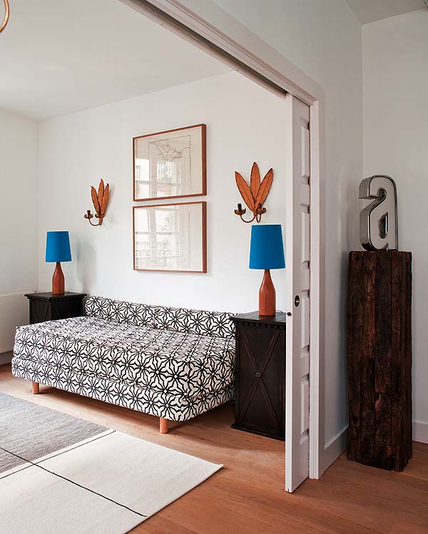 Esta vivienda constituye una ilustrativa lección sobre cómo colocar obras de arte con sensibilidad y acierto. Ideales las estudiadas composiciones en las paredes o colocaciones sobre muebles o suelo: puro equilibrio. En el dormitorio destaca el cambio de paleta cromática con el uso de un tostado oscuro, junto con la utilización de elementos singulares, como la puerta de tres piezas como cabecero, la mesita de plástico y los elementos decorativos.
