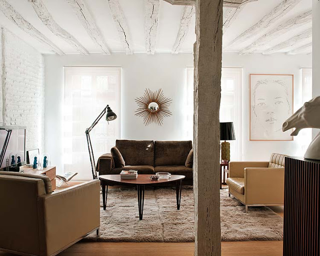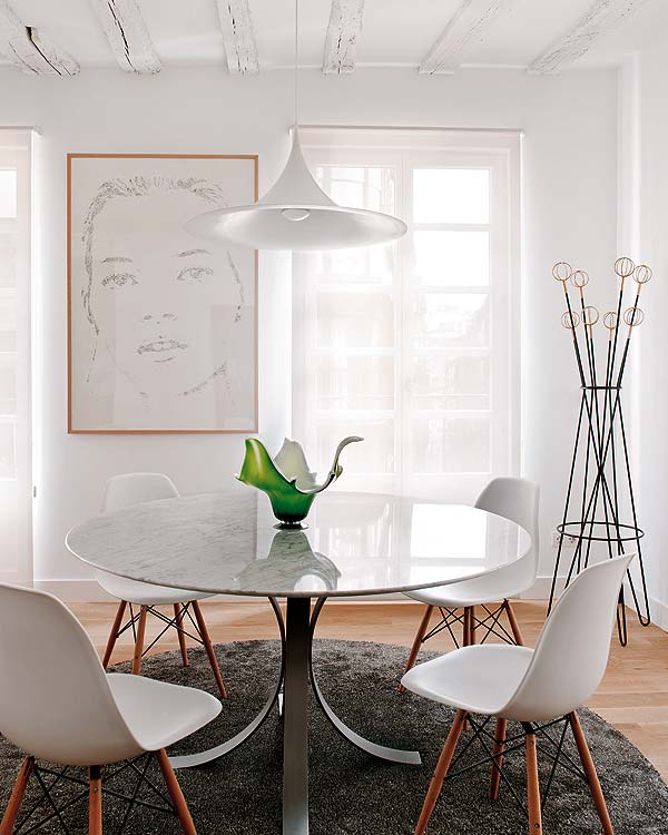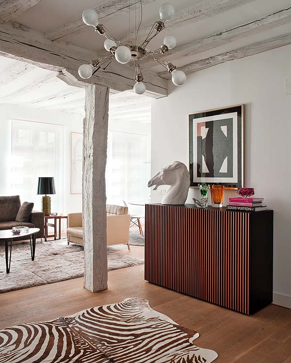 Una vivienda donde se consigue respetar la estructura original, sacándole partido al cuidar de forma perfecta y exquisita sus acabados, colores y el mobiliario elegido. Destacan las piezas Vintage, de tipo industrial y las numerosas obras de arte contemporáneas. La gama de tonos tostados de los muebles se mezclan con la claridad del ambiente. Cuatro alfombras unidas delimitan la zona de tertulia, con un sofá de terciopelo y butacas de piel.