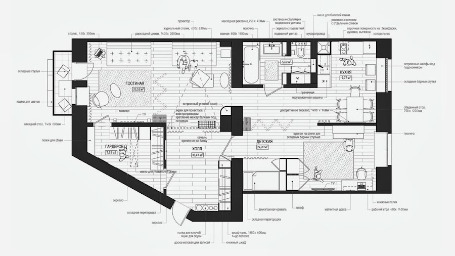 Este es el diseño de una vivienda de 83 m2 en Moscú, se trata de un espacio muy luminoso, con el objetivo que fuera una espacio abierto, ayudando a la funcionalidad de este espacio, transformando el espacio a través de los muros y los biombos.