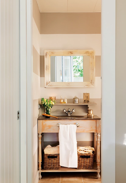 El baño tiene un aire campestre, con papel pintado de rayas en la pared, que aporta un toque joven. El suelo es azulejo de piedra, clarito y super agradable.