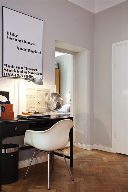 Sinceramente me llama mucho la atención la mezcla de piezas de diseño con mobiliario de Ikea, el parqué de espiga le da un aire muy cálido, las innumerables laminas y fotos que cuelgan de todas sus paredes, formando así un conjunto general de lo mas atractivo.