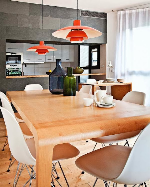 Este piso de tres dormitorios, representa la elegancia al natural. La mezcla de la madera y sus notos naturales en la decoración , lo hace un lugar ideal para vivir, sin grandes pretensiones. Sencillo y acogedor ,¿ que más se le puede pedir a un hogar? La mesa de madera , se convierte en el centro de las miradas gracias a la composición de lámparas colgantes , que es el centro de todas las mirad ...