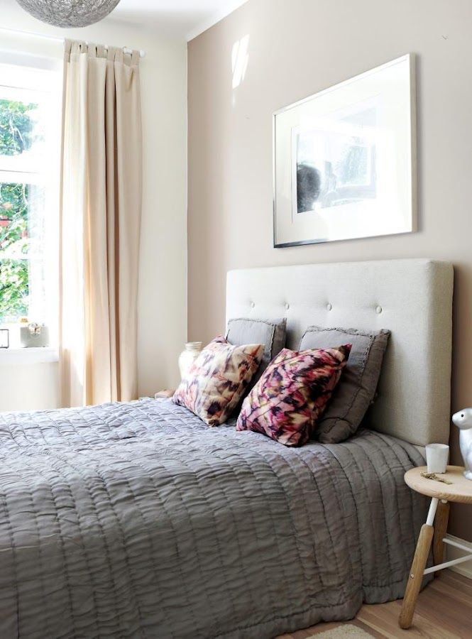 En el caso que tengas un dormitorio para invitados esta solución es maravillosa, han pintado la pared del mismo color "café con leche" que la del dormitorio principal (así aprovechas la pintura) SIN CABECERO, han creado una bonita combinación de cojines y textiles.