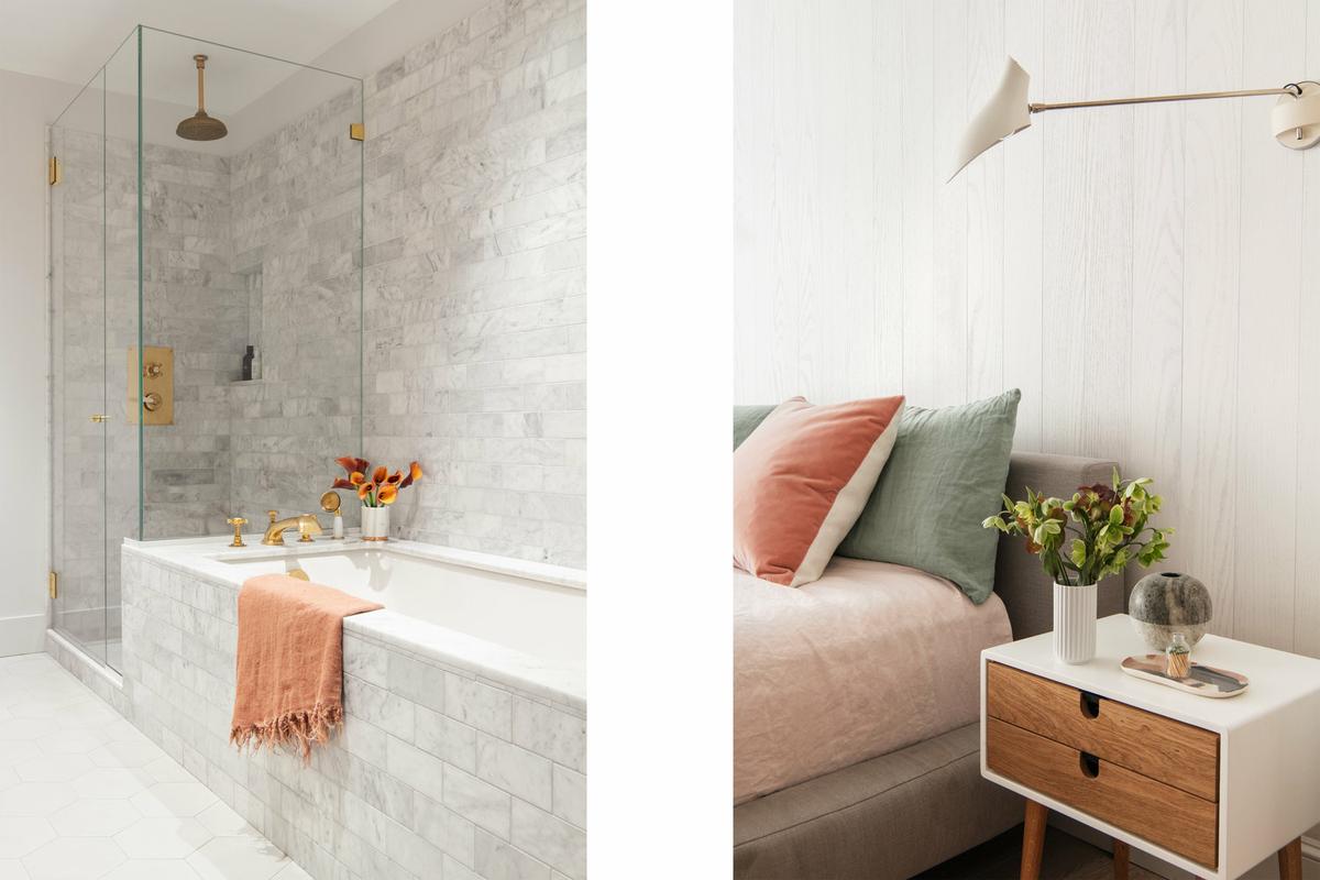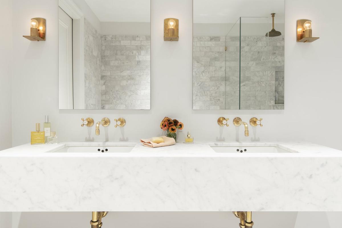 El baño principal es muy elegante, combinando mármol, oro y tonos blancos y perlas. Y para dar calidez al dormitorio principal se ha revestido la zona del cabecero con un panelado imitación madera blanqueada.