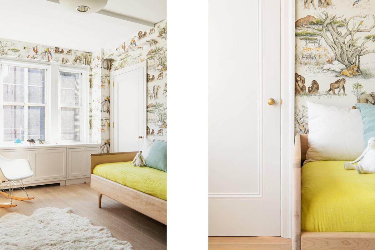 El dormitorio infantil es otra maravilla con el papel de motivos animales que reproduce la selva africana.