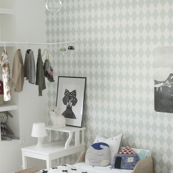 El papel pintado de rombos en verde, creo que es de lo más acertado. Da color al dormitorio, sin restar luminosidad al espacio.