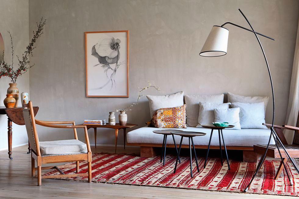 Bajo una paleta neutra, encontramos toques de color que dinamizan el conjunto. La bonita butaca de madera del salón es de Tado, en el suelo alfombra de Zigler. En la segunda imagen, destaca la alfombra marroquí de lana y rafia comprada en el rastro madrileño, sus tonos rojizos hacen que el resto de los muebles, de colores neutros y las paredes, destaquen.