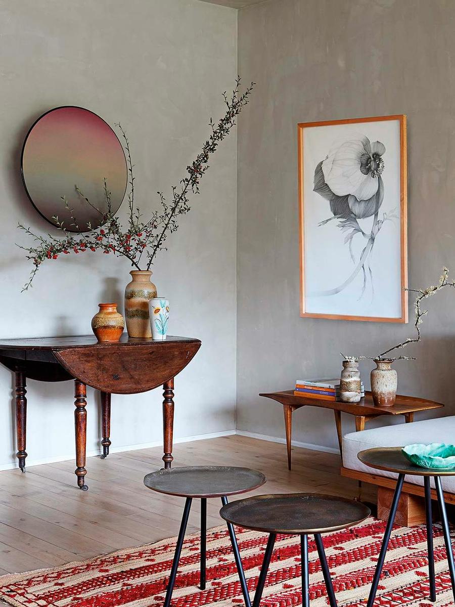 En ese mismo espacio, luce una mesa plegable del Siglo XIX con jarrones de la antigua República Federal Alemana, adquiridas en el estudio. Lo que pensaba que era un original cuadro, ha resultado ser un altavoz circular de Bang & Olufsen (se nota que me queda mucho por aprender de estos aparatos electrónicos). La mesita baja rectangular de corte mid-century, se adquirió en Restelo.
