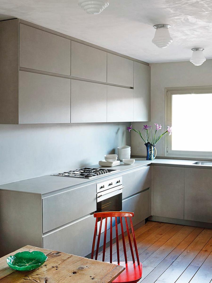 La cocina es una de las zonas que más me ha impactado. Tras el cerramiento, encontramos un comedor, con una mesa del Siglo XVIII también de Restelo y sillas tipo shaker de Vintage 4P y La Brocanterie, jugando con varios colores. Contrastan con los muebles, diseño de Erico Navazo, realizados con placas porcelánicas de Techlam, un revestimiento ultrafino de la firma Levantina, que tiene múltiples aplicaciones. Con este mismo material se hizo también la encimera. Me gusta muchísimo cómo han quedado los muebles, diría que se funden con el resto de las paredes de la vivienda.