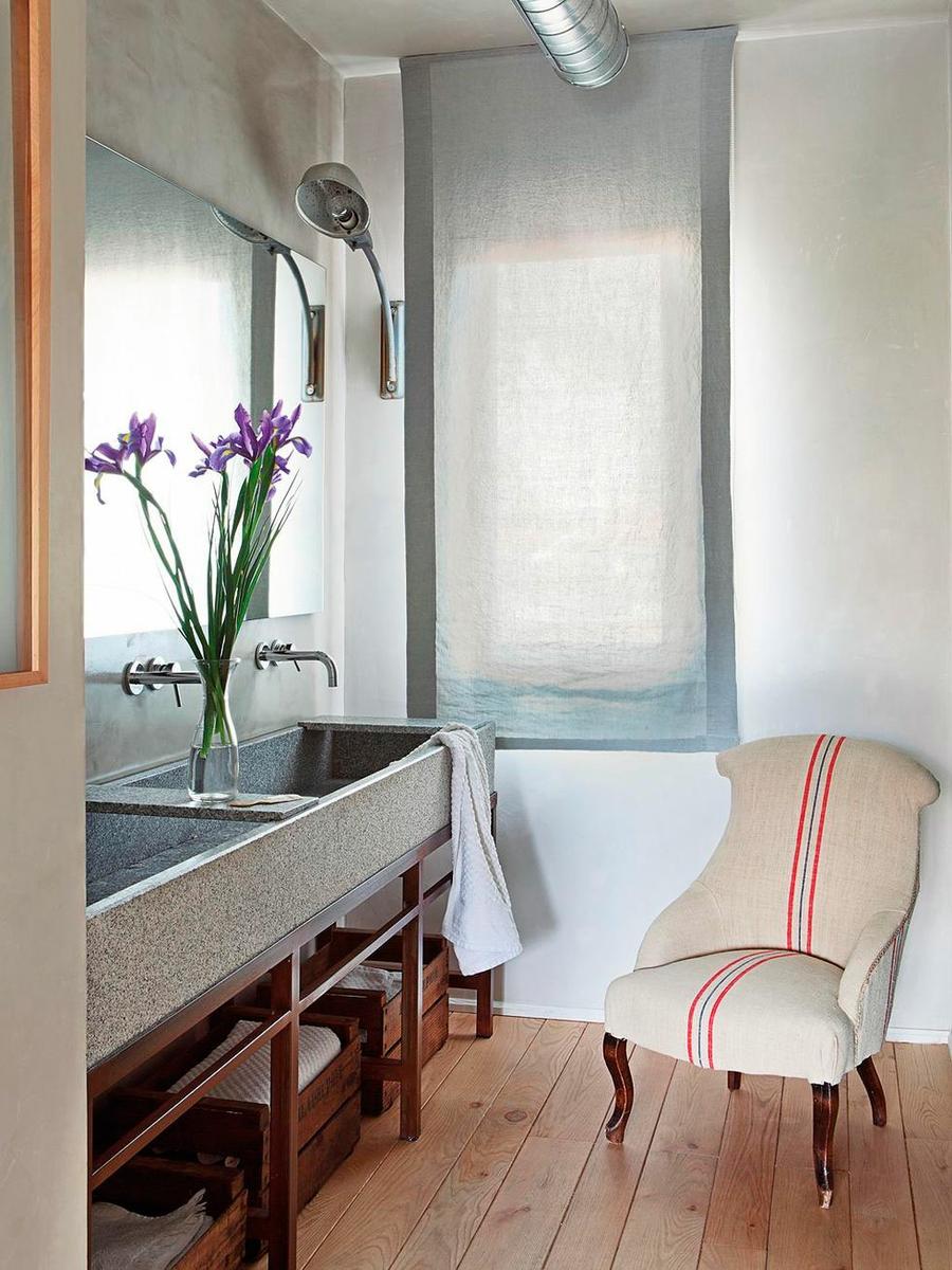 En el baño el protagonista es el mueble del lavabo, diseño del estudio. Se realizó con patas de hierro que llevan una pátina oxidada y sostienen dos grandes lavabos de granito. La grifería encastrada en la pared es de la firma Cristina, adquirida en Azulejos Peña y la descalzadora, al igual que la que hay en el salón, es una pieza familiar tapizada con un lino antiguo húngaro.