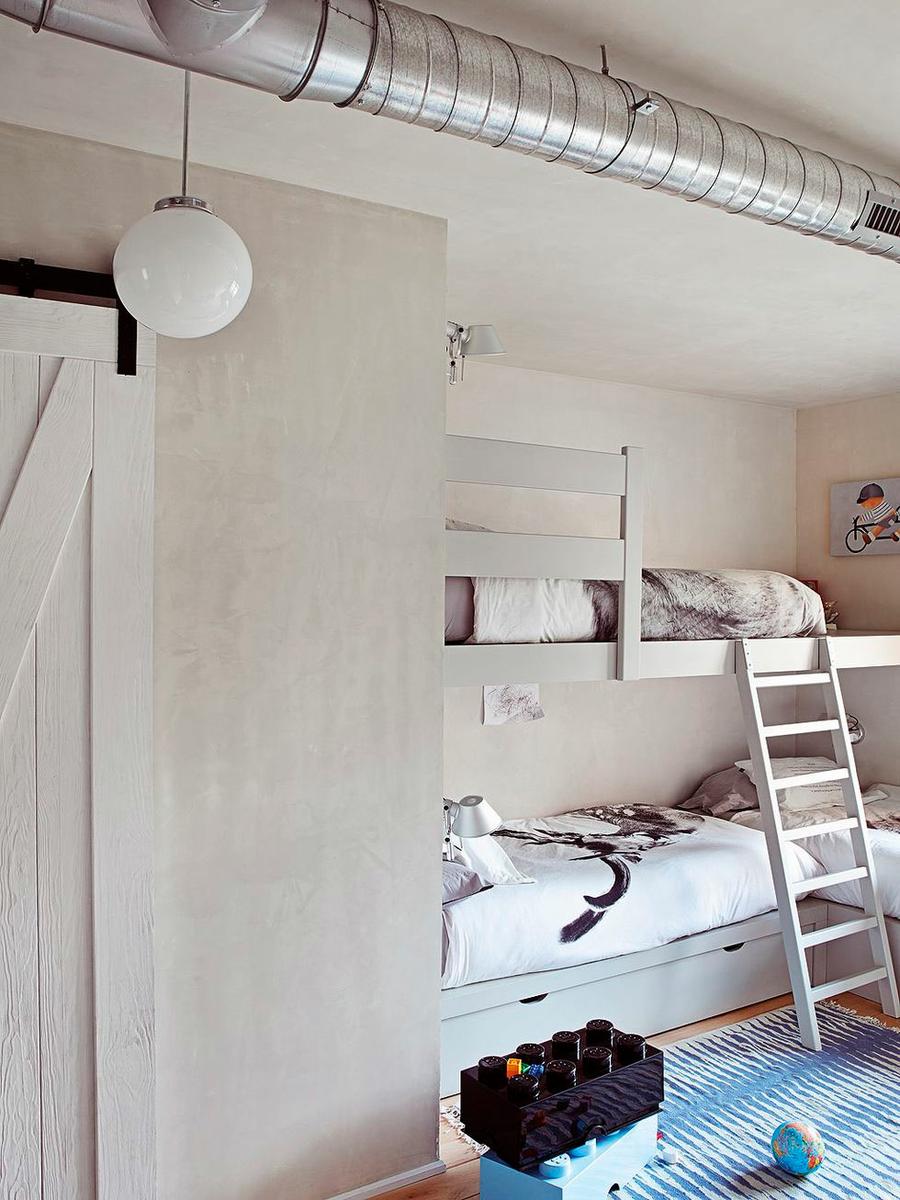 En el dormitorio infantil a pesar de tener literas y una cama extra, lejos de parecer un espacio pequeño, ha quedado perfectamente integrado, pintando las camas del mismo color que las paredes, los edredones de Nordic Elements, tampoco llevan demasiado color, de tal forma que la habitación se ve ligera.