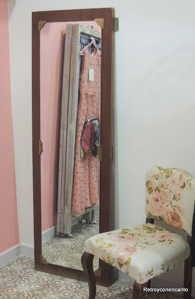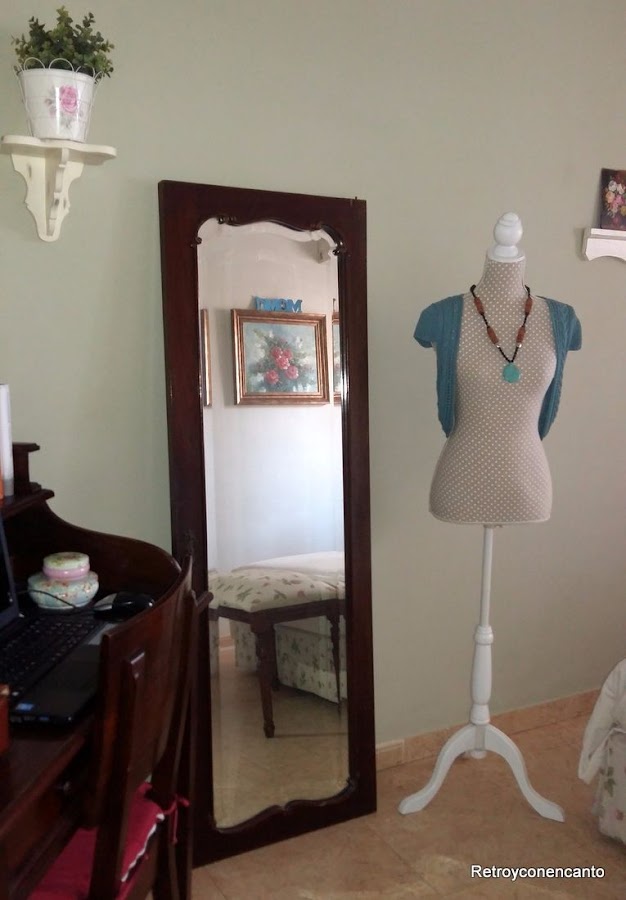 Seguro que os pasa lo mismo que a nosotras cuando vamos a elegir el modelito idóneo para el evento del día... La cama termina llena de vestidos, pantalones, tops y cinturones... tras un sinfín de pruebas e indecisiones, Una de nosotras, además, tenía que desplazarse al cuarto de su hija a mirarse en un espejo de cuerpo entero porque en su dormitorio aún no había el apropiado, según sus gustos. Años ha que buscaba una puerta de armario antigua para apoyar en la pared y disfrutar del placer (o el horror, que todo es posible) del reflejo propio con toda una variedad de indumentarias. Pues por fin ha llegado el día en que localizamos la puerta en cuestión. En realidad íbamos en busca de una lámpara de techo para nuestra amiga Marisa, a la que un día redecoramos la suya con tan malísima pata que se nos cayó. Tras una leve vida en el techo de su salón, el brazo que el soldador unió al resto de la lámpara, volvió a desprenderse y, al enterarnos (bien tarde), decidimos regalarle otra. Pero no, no apareció la lámpara y sí la puerta, preciosa ella, con cristal biselado y una bonita moldura decorativa enmarcándolo. ¡No nos pudimos resistir! Entre las dos la metimos en el coche y ¡pa casa! Una buena limpieza y..., ya luce en la pared oportuna.
