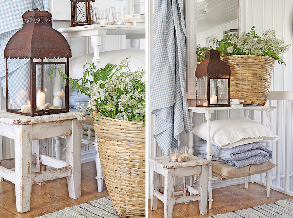 Hoy os traigo un rincón con aires de playa y mar, con cierto estilo Shabby chic. Un rincón realizado con objetos reciclados, como el taburete, la estantería o el farol y elementos que nos recuerdan al fresco aire del mar, como las conchas los textiles en lino o algodón a rayas y cestones de rattan con delicada paniculata.