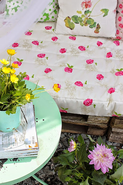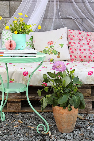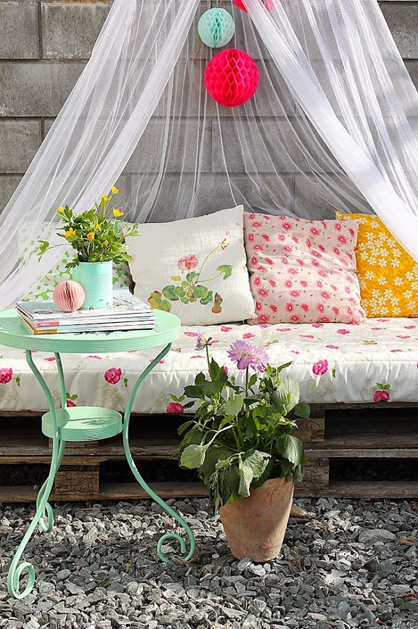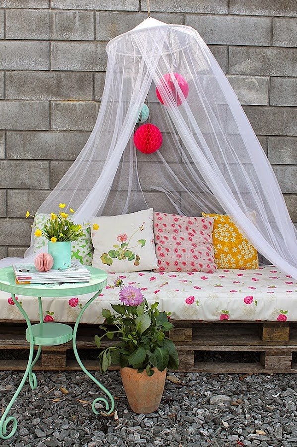 La idea no ha podido gustarme mas, palets pintados oscuros un tono similar al que podría ser el tinte en nogal, las telas estampadas florales le dan un aire muy vintage y junto con la mosquitera y los pompones de nido de abeja en tonos fucsias y mint el resultado es totalmente espectacular.