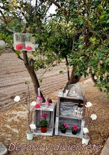 Como nos gusta hacer cosas , requisamos tres jaulas de pájaritos y las pintamos , una la colgamos del árbol y las otras dos las pusimos encima de las cajas .... quedan muy bien !!