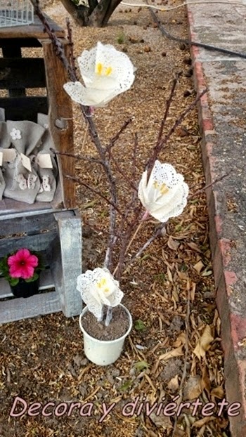 Y ahora unas cuantas imágenes mas detallistas del montaje , como estas pequeños " árbolitos " donde utilizamos las flores que hice con blondas de papel , si queréis volver a ver como se hacen os dejo en enlace Flores de blondas de papel .