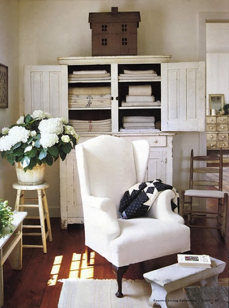 Este primer lugar de descanso me parece perfecto en todo su conjunto, la butaca blanca con el banco para poder reposar los pies, el taburete sobre el que ponemos una planta, el mueble aparador alto en el que se guarda la ropa blanca?¿quién no quiere un rincón así en su casa?