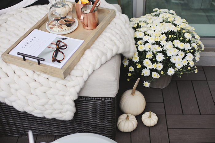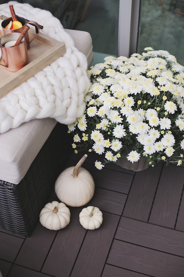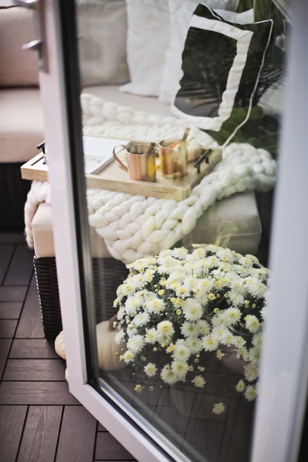 Así que hoy vamos a compartir este rincón precioso que huele a todo lo que está por venir los próximos meses. Además, veo como nuestra manta XXL también es un acierto en el exterior de la casa.