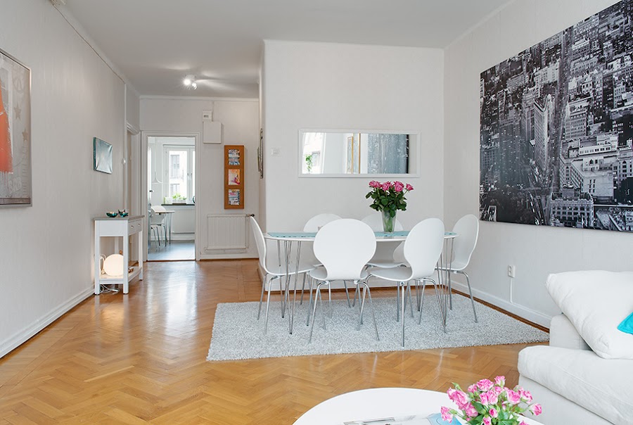 Ayer mismo os escribía sobre la nueva colección de fluor de Zara home y hoy os traigo un ejemplo de un salón con detalles en un color turquesa de lo más fluorescente, para que veáis en un ejemplo práctico de las tendencias que a veces hablamos en nuestros post. Es un salón de estilo nórdico, como siempre decorado en blanco, luminoso, de lineas puras y sin recargar, donde la atención se centra en el color turquesa y la gran fotografía del comedor.