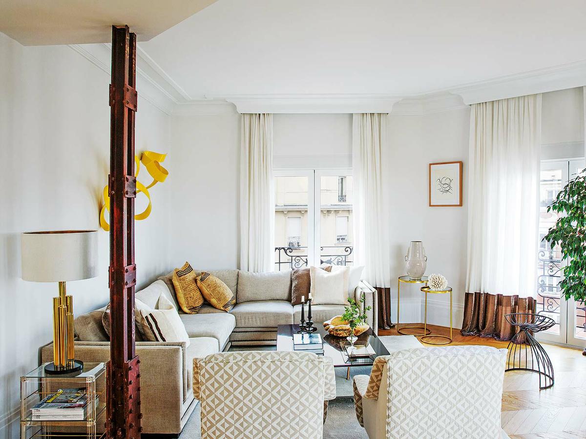 Una zona de estar amplia y confortable, presidida por un sofá en esquina que abarca todo el espacio y que amplía las zonas de asiento hasta el infinito. Esta configuración le permite a la interiorista añadir dos butacas complementarias e incluso algunas piezas auxiliares más decorativas. Resultado, un salón acogedor, cómodo, funcional y precioso, gracias entre otras cosas, a los acabados: telas maravillosas, lacas brillantes, vidrios y metales.