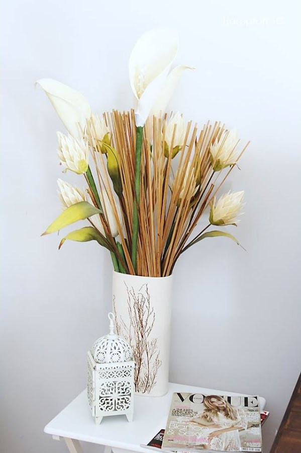 Al lado un sillón orejero y un velador decorado con flores y un farolillo marroquí.