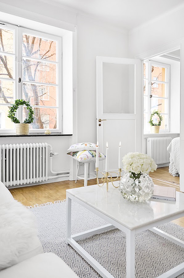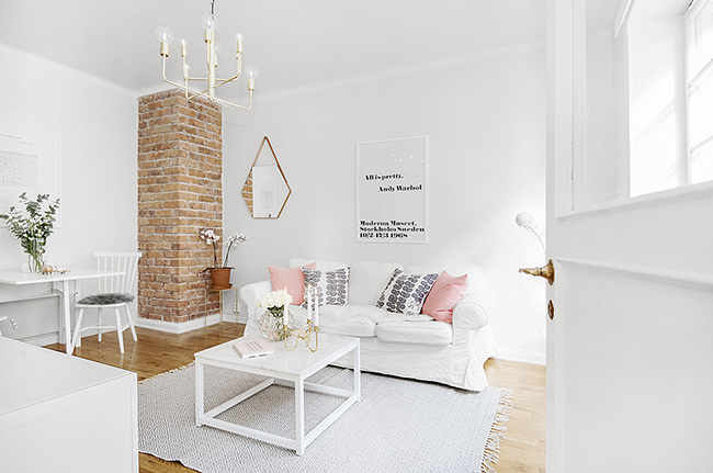 Si os gusta este color y además eres amante del nórdico clásico renovado esta idea te va a venir al dedillo, combinan todo con mucho gusto con un resultado acogedor y atemporal, toques metalizados y ramas de eucalipto... un pupurri de tendencias muy acertadas que convierten a este salón en un claro ejemplo low cost con mucho estilo.