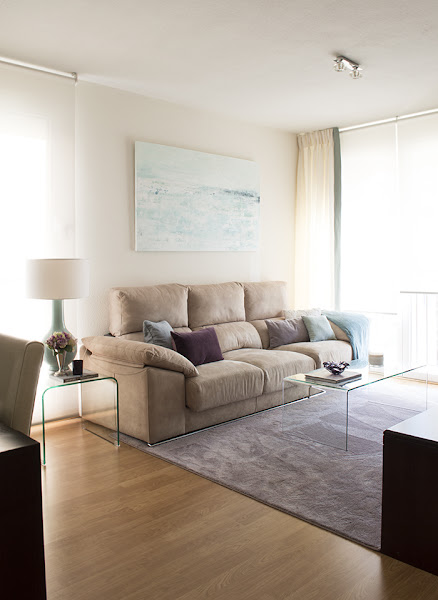 Añadí un poco de color con unos cojines, la alfombra efecto seda, la lámpara de cerámica en azul agua y el cuadro, obra de J.M ( Paisaje Turquesa)