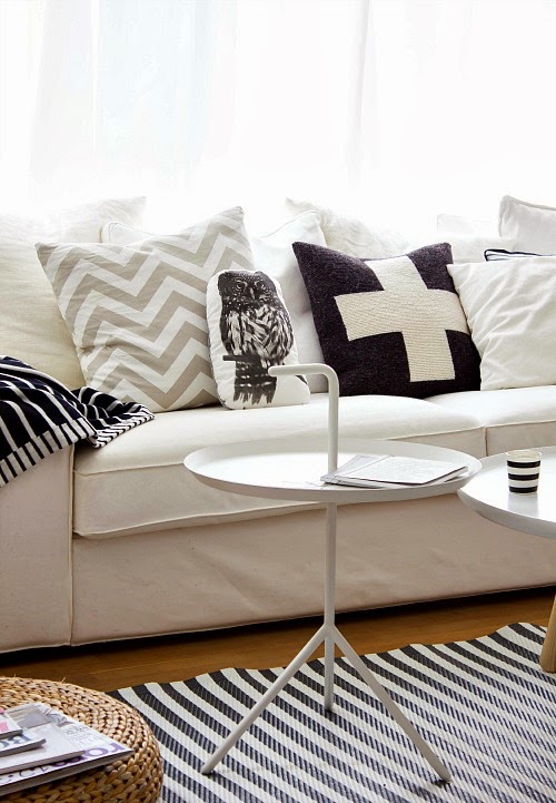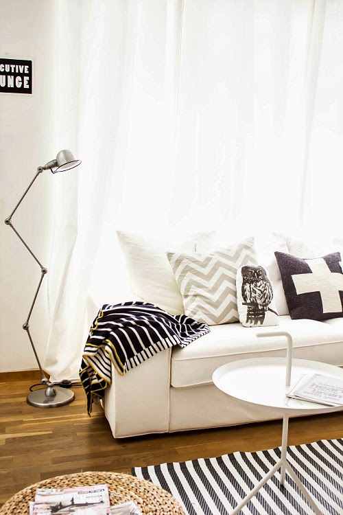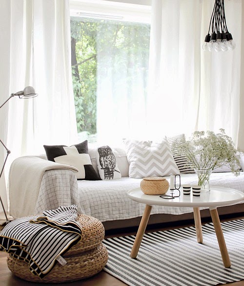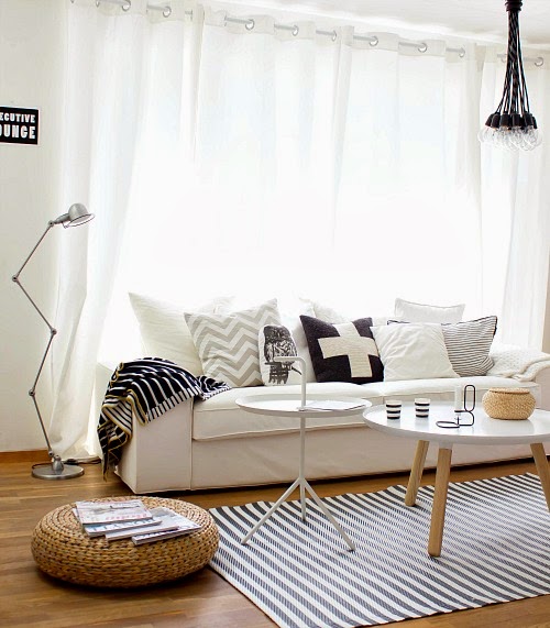 Un sencillo cuarto para la televisión, luminoso y acogedor, compuesto por un sofá blanco y unos textiles combinados en blanco y negro. Siguiendo con el estilo y las lineas sencillas se completa con unas mesas auxiliares y una lampara de pie . Como podrás comprobar las cortinas al igual que el resto de la decoración no tienen grandes pretensiones, eso sí el resultado del conjunto es genial. Lo cual nos hace que pensar que no hay que gastar un gran dineral para tener un saloncito maravilloso, solo necesitamos elegir el mobiliario y complementos adecuados.