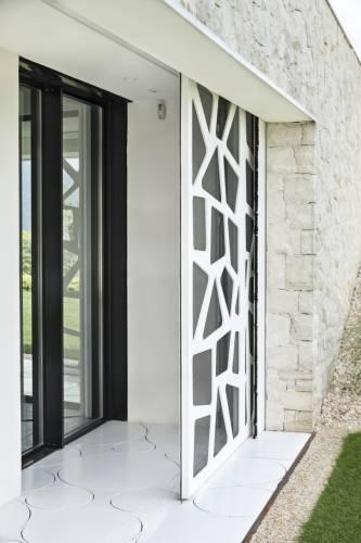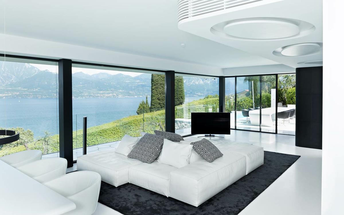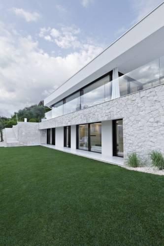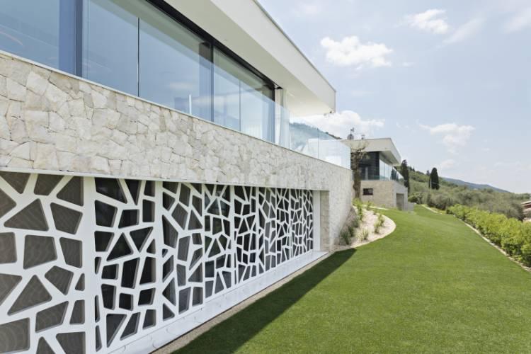 Un material perfecto para un diseño excepcional El cuarto de baño principal, con un inodoro oculto, cuenta con un lavabo de 1,90m y presenta una gran ducha con unas fascinantes vistas del lago de Garda. El suelo, las paredes y el techo, están realizados en la piedra acrílica de LG Hausys de forma que todo queda fundido como si se tratase de una única pieza. La calidad de HI-MACS® permite que toda la habitación, al no presentar juntas visibles, sea higiénica y fácil de limpiar, con nichos integrados para el almacenamiento y la iluminación, que se unen con el acabado liso. El dormitorio principal es contiguo al baño, separado por una puerta corredera. Aquí se pueden encontrar unos elementos de mobiliario sencillos de Living Divani en blanco y negro. A su lado, se encuentran el vestidor y el gimnasio. Uno de los aspectos más destacados del espacio es la enorme pared de celosía deslizante que recorre toda la parte frontal de la planta baja. Las puertas, también realizadas en HI-MACS® ofrecen un diseño solo posible por unas complejas técnicas de fresado. Al mismo tiempo, este extraordinario elemento de diseño se puede bloquear, aumentando así la seguridad de la propiedad. Si por el contrario, los propietarios quieren disfrutar de unas vistas sin interrupciones, cada una de las 4 secciones se abre fácilmente, deslizándose a través de un hueco en la pared. Cada una de estas habitaciones, así como el mobiliario, han requerido amplias habilidades, experiencia y destreza por parte de arquitectos y manipuladores. Los constructores lo han encontrado en Dreer-Graf. Como material principal para todas las estancias hemos trabajado con HI-MACS® de Klöpfer Surfaces, ha recalcado Karl Dreer, responsable de proyecto a cargo de esta espléndida casa. El resultado final es una sutil mezcla de elegancia, luz y artesanía caracteriza el ambiente de toda la vivienda. Independientemente del lugar de la casa en el que se encuentre, la luminosidad y el lago de Garda determinarán el ambiente.
