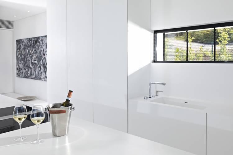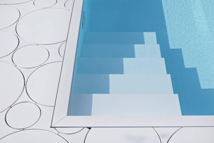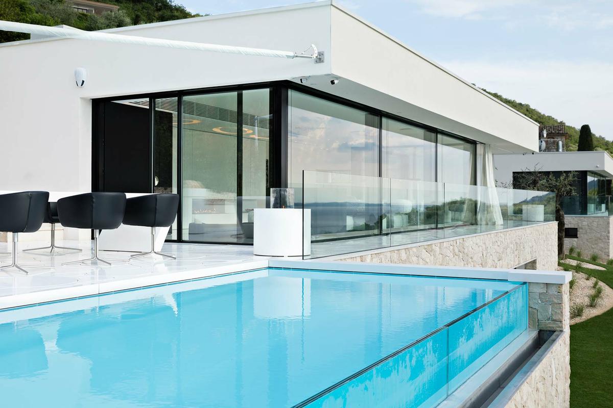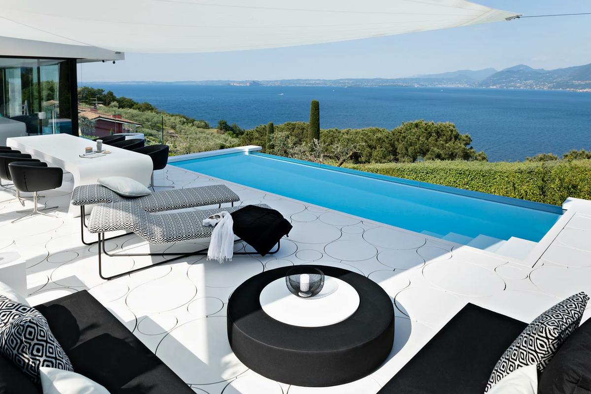 Los propietarios querían algo diferente, con un acabado atractivo, que siguiese las últimas tendencias en diseño. De esta forma, supimos de inmediato que HI-MACS® era el material perfecto, ha explicado Karl Dreer, director ejecutivo de la empresa de diseño e interiorismo, así como un experto en lo referente al procesamiento de la piedra acrílica. De hecho, los mismos propietarios la llaman, no sin razón, La casa HI-MACS®. A parte de la fabulosa zona de la piscina: los suelos de la terraza, gran parte del mobiliario y elementos de la cocina y del baño están realizados en la piedra acrílica de LG Hausys.Las grandiosas superficies cúbicas de la casa son un claro ejemplo de arquitectura que plasma la afirmación menos es más. El color blanco y las líneas rectas contribuyen a que esta vivienda fluya directamente del azul claro de la piscina hacia el agua más oscura del lago de Garda. La piscina de hormigón, con una longitud de 6m, se funde a la perfección con el suelo de la terraza. Esta piscina desbordante es el lugar más destacado de la casa y el ricón perfecto para que los propietarios, junto a familiares y amigos, se relajen durante la época estival. Además, la temperatura del agua se regula ecológicamente con un sistema fotovoltaico de última generación y se limpia de forma automática debido a una unidad de medición que determina el cloro y el valor de Ph. Toda la tecnología de la piscina, al igual que el resto de la casa, se ha planificado con gran precisión.