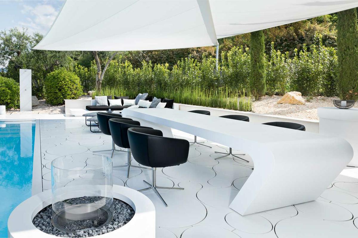 Cuando el minimalismo se funde con la suntuosidad de la piedra acrílica Toda la zona exterior está pensada para convertirse en un espacio de relajación y bienestar. La piscina, la ducha y los enormes muebles de la terraza ofrecen el marco perfecto para disfrutar al máximo de unas fantásticas vistas, donde la línea de diseño de Living Divani se alterna con piezas únicas realizadas en HI-MACS®. La gran mesa del comedor exterior merece una atención especial, ya que tiene una longuitud de 4m y su forma futurista y en voladizo la convierte en una magnífica pieza central. Ha sido realizada gracias a la capacidad de termoformación y unión sin juntas visibles de la piedra acrílica, que permite moldear prácticamente con cualquier forma y diámetro. Además, la terraza cuenta con un asador eléctrico de teriyaki, envuelto en un revestimiento redondo de HI-MACS® que se convierte en el núcleo de numerosas veladas. Una descomunal zona de asiento de 3,40 x 4,40m, también de piedra acrílica, ofrece un amplio espacio para relajarse. Unas pequeñas mesas auxiliares completan el cuadro. En las horas vespertinas, la piedra acrílica resplandece y brilla bajo la luz. Su resistencia a los rayos UV, al agua y a la intemperie garantizan que el material sea perfecto para esta aplicación de exterior.