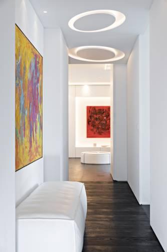 Un pasillo que marca la diferencia La escalera hacia la planta baja es la primera zona que se diferencia del HI-MACS® Alpine White, pues contrasta con el parqué de roble ahumado oscuro que aporta calidez, sin comprometer el minimalismo elegido. Una vez en la planta inferior, la vista se dirige hacia un pasillo de 12m de largo, desde el cual se accede a distintas estancias, todo a través de puertas integradas en la pared. Las espectaculares obras de arte actúan como salpicaduras de color en este ambiente en blanco y negro.