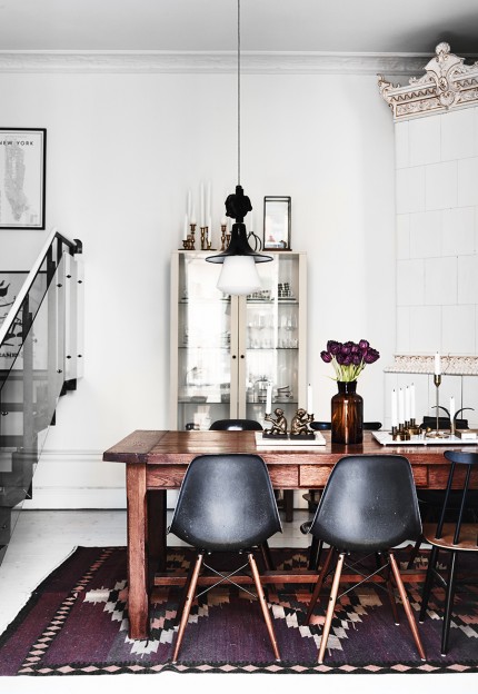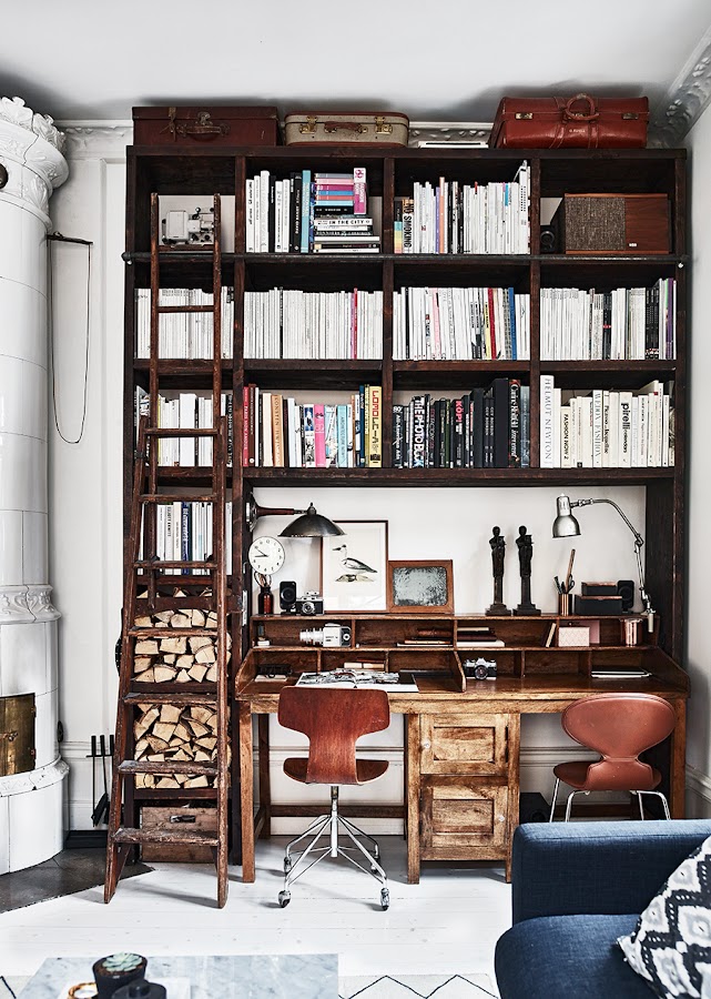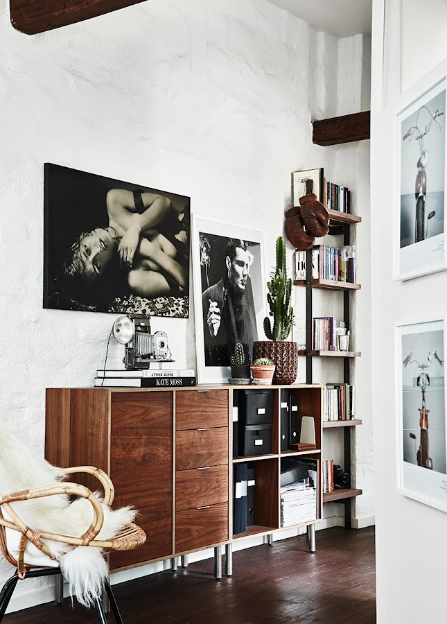 El sabor añejo de la madera oscura de los muebles de los años 40 y 50, así como las lámparas industriales para Sara es más aficionado a un poco más ligero y más aireado decoración, mármol y bronce. Una gran interés en la fotografía tienen en común. Y no parecen haber sido mayores problemas las preferencias diferentes. La gran librería del salón, uno de los centros neurálgicos del a vivienda, se encontraba en la casa y se recuperó acomodando el escritorio debajo. Las lámparas y sillas las recogen en los viajes. Toda la estantería llena de libros de fotos y revistas de fotografía, se adapta en dimensiones para acomodar el escritorio del doctor y se recuperan unas sillas de Arno Jacobsen compradas en Londres. Al inicio, el apartamento se trataba de un dúplex con una entrada por ambos lados de la vivienda. La cocina, la sala de estar y el comedor estaba en la planta baja y el dormitorio principal y el de invitados, arriba.