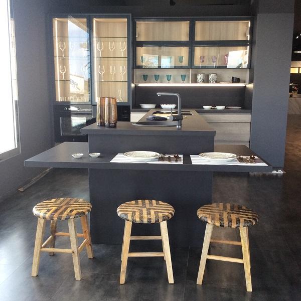Son diseños dentro del nuevo Alvic Center Menorca un showroom de muebles de cocina donde se pueden ver todos los acabados de Alvic y las ultimas tendencias en el diseño de la cocina, como en este ambiente, donde se ha combinado el color gris antracita con un laminado en madera en tono natural, junto a las vitrinas con marco negro y cristal trasparente tan de moda en la cocina actual, y como la distribución de la cocina cuenta con una barra de altura mesa, quería unos taburetes bajos que no pasaran desapercibidos y a la vez aportaran un plus al diseño, y conseguí lo que buscaba con el taburete Attis de Sklum, un taburete bajo de madera y un dibujo geométrico en el asiento en gris. ¡Era este taburete!
