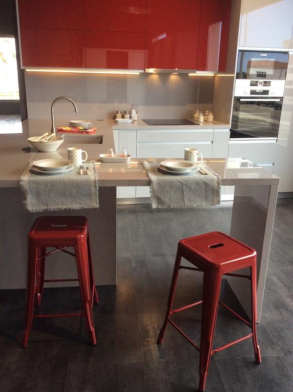 En el segundo ambiente lo tenía claro, quería un taburete rojo que continuara con el diseño de la cocina y a la vez aportara un toque extra de color, ya que en los muebles de cocina predomina el color Gris Nube con frentes en Luxe by Alvic y necesitaba un poco de alegría, así que el modelo LIX de Sklum con un diseño inspirado en el taburete Tolix fue una apuesta segura.