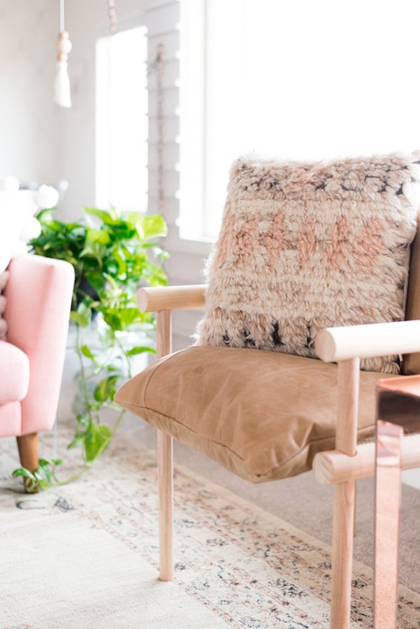 Este salón es el claro ejemplo de como un toque de color combinado con colores neutros es acierto seguro. En este caso, han decidido utilizar un precioso sofá rosa, con colores en textiles (mantas, cojines) muy claros, paredes blancas, alfombras de tonalidades y estampados sutiles, madera y por supuesto los toques de vegetación y el resultado es admirable. Ejemplo de como sencillez y simplicidad realizan el perfecto binomio para crear un espacio agradable y confortable.