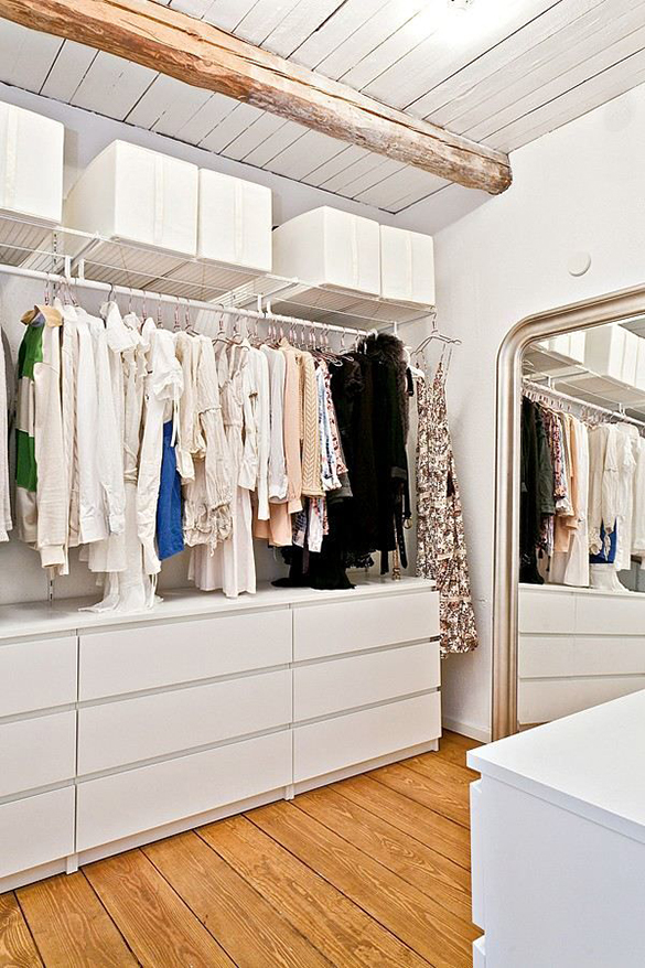 Con todos los sistemas de almacenaje de hoy en día podemos permitirnos un vestidor con todo a la vista y bien ordenado por muy poco dinero, siempre y cuando no te importe no tener puertas en ese caso este sistema no te va a valer mucho pero si quieres empezar con poca inversión y una pieza versátil que luego puedas poner en otra estancia y dure muchísimo la cómoda Malm puede ser una gran aliada.