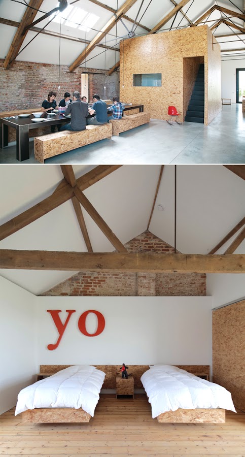 En el interior se ha reforzado la carpintería del techo y lo mas increible es que todos los tabiques interiores y puertas de la casa , así como los muebles , armarios , estanterías , camas ......., se han hecho con el mismo material virutas prensadas y resina de árbol , a mi me gusta el resultado , muy lineal , poco convencional y creo que no te llegas a cansar de el , a vosotros que os parece?