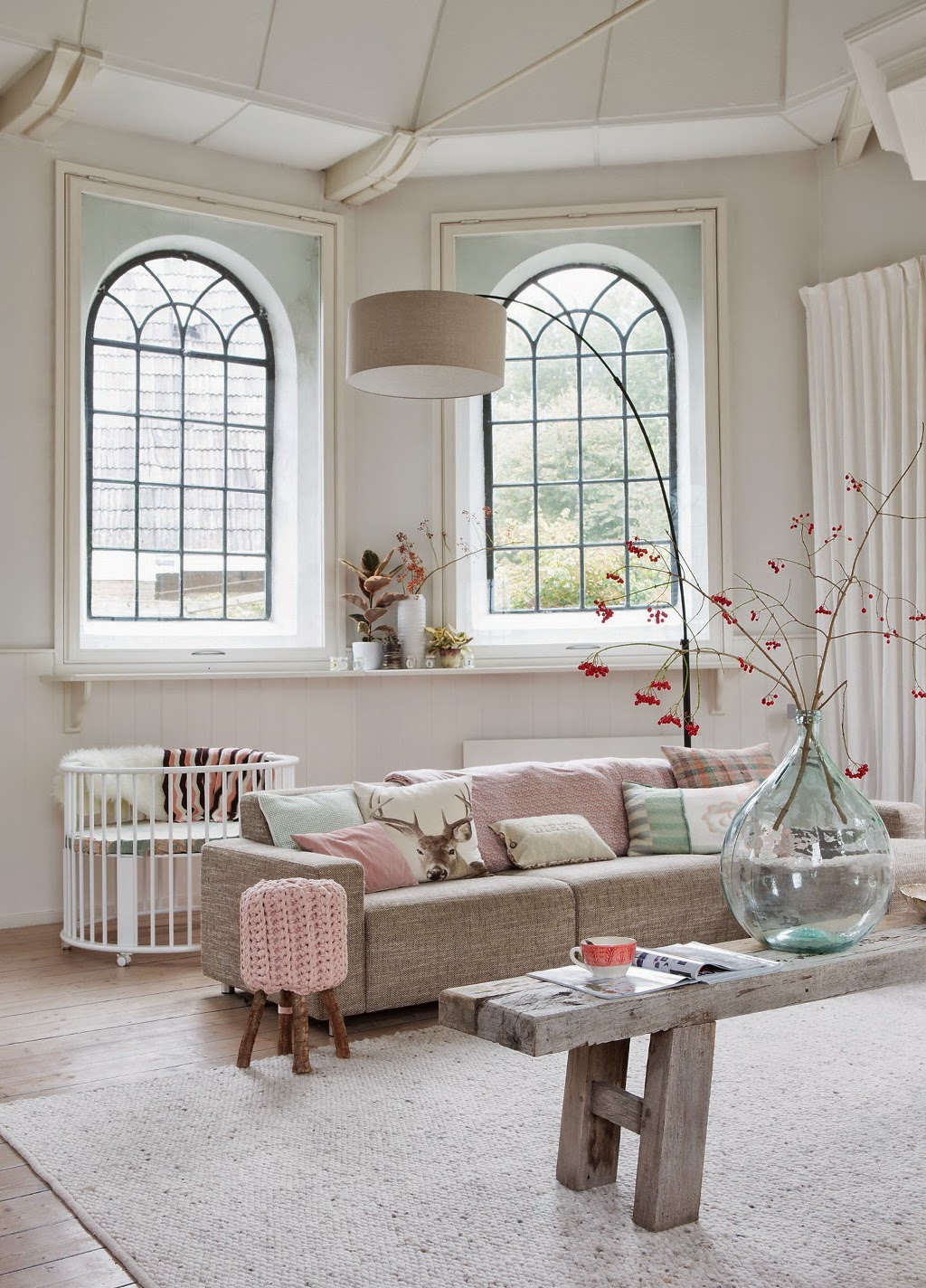 Esta vivienda situada en los Países Bajos anteriormente a que la adquiriesen sus propietarios era una Iglesia. Esta circunstancia condicionó relativamente la decoración, optando por colores blancos y delicados tonos pasteles.