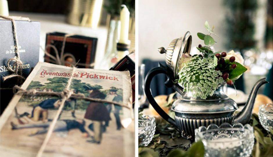 Libros antiguos, teteras,bandejas que componían el centro de las mesas, maletas para el setting plan, globos terraqueos para la mesa de tabaco , fotografías y otras tantas piezas encontradas por casa se funden en la decoración como preciosos bodegones.Plantas aromáticas como la lavanda el tomillo y el romero recolectadas en el monte por el propio padre de la novia, diseños de las etiquetas de los tarros de miel para regalar realizadas por un primo, hacen de la decoración y cada detalle algo personal y único. Con el valor añadido de la colaboración he implicación de familiares y amigos. ¿A qué es bonito?.